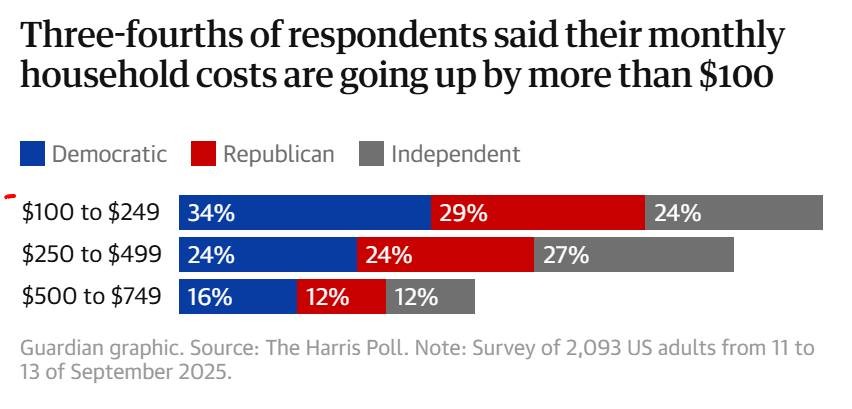Chín tháng sau khi Donald Trump nhậm chức với lời hứa sẽ giảm giá ngay "ngày đầu tiên", phần lớn người Mỹ cho biết chi phí hàng tháng của họ đã tăng từ 100 đến 749 đô la, theo một cuộc thăm dò độc quyền mới được thực hiện cho tờ Guardian.