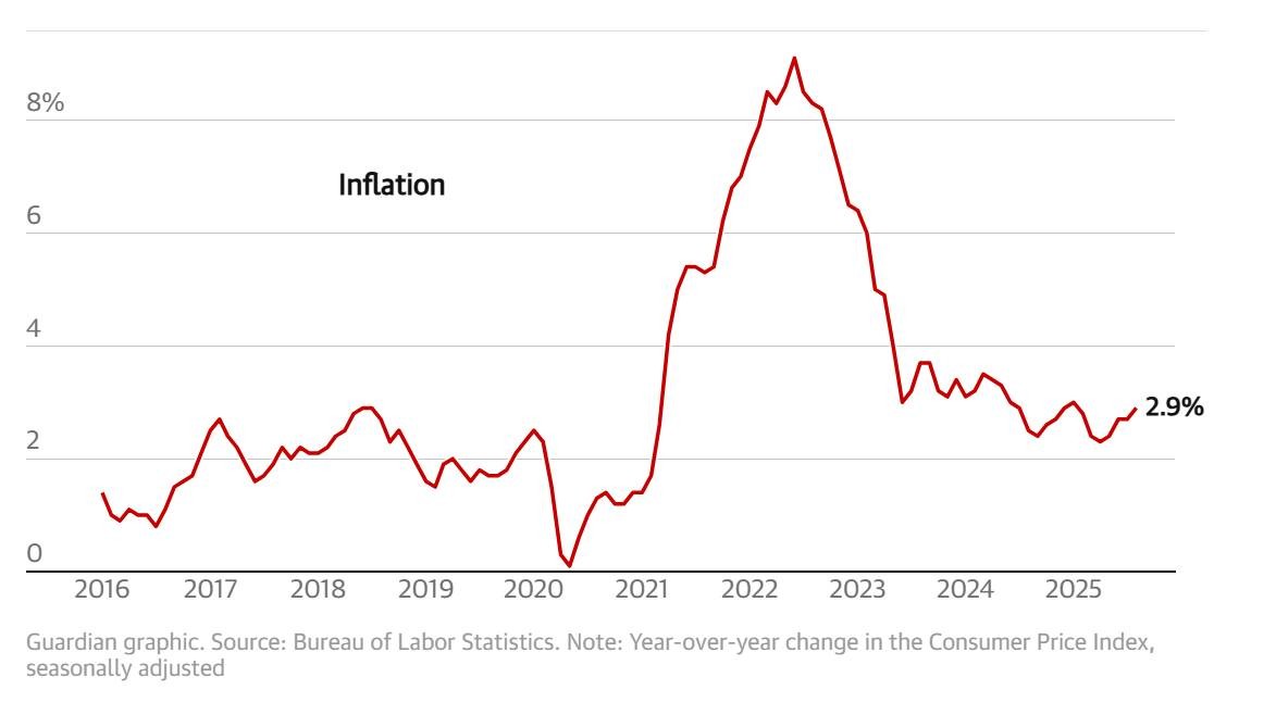 Tỷ lệ lạm phát đã giảm từ mức 3% hằng năm vào tháng 1 , khi Trump nhậm chức, xuống còn 2,9% hằng năm vào tháng 8 (số liệu mới nhất được công bố). Tỷ lệ này đã giảm đáng kể so với mức đỉnh hơn 9% vào năm 2022, nhưng vẫn cao hơn đáng kể so với mục tiêu 2% của Cục Dự trữ Liên bang.