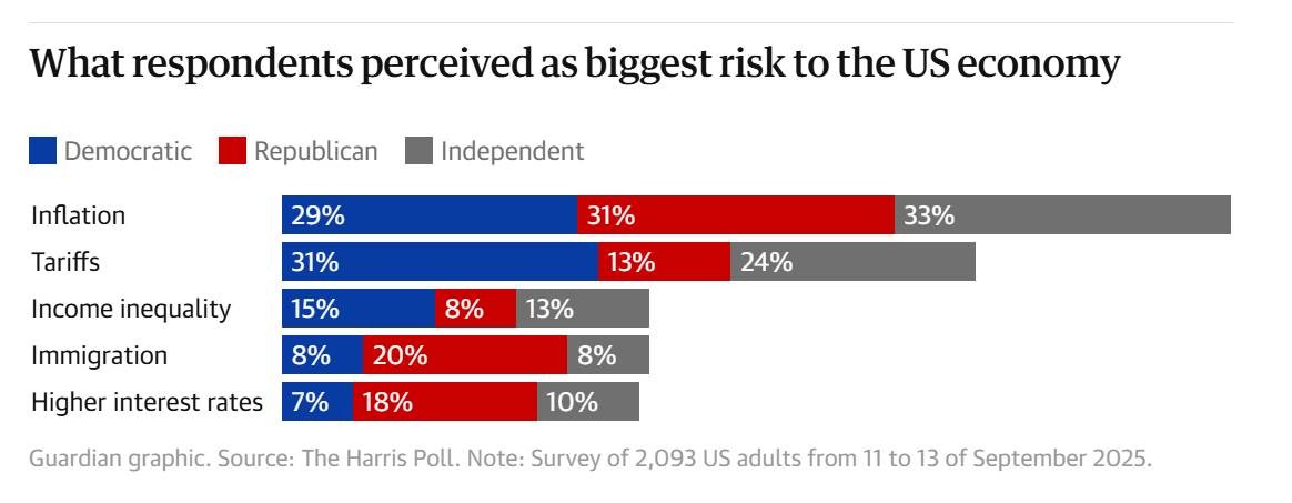 Lạm phát được đánh giá là rủi ro lớn nhất đối với nền kinh tế Hoa Kỳ khi những người được hỏi được yêu cầu chọn một vấn đề từ danh sách các mối đe dọa, bao gồm nhập cư, nền dân chủ Hoa Kỳ và thuế quan. Lạm phát là rủi ro hàng đầu đối với đảng Cộng hòa (31%) và độc lập (33%), và là rủi ro lớn thứ hai đối với đảng Dân chủ (29%), sau thuế quan.