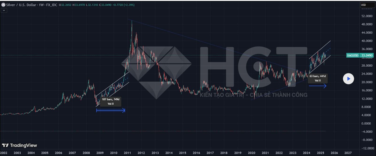 Giá bạc tăng đều đẵn theo kênh giá và có thể bứt phá mạnh, tương tự như giai đoạn 2008