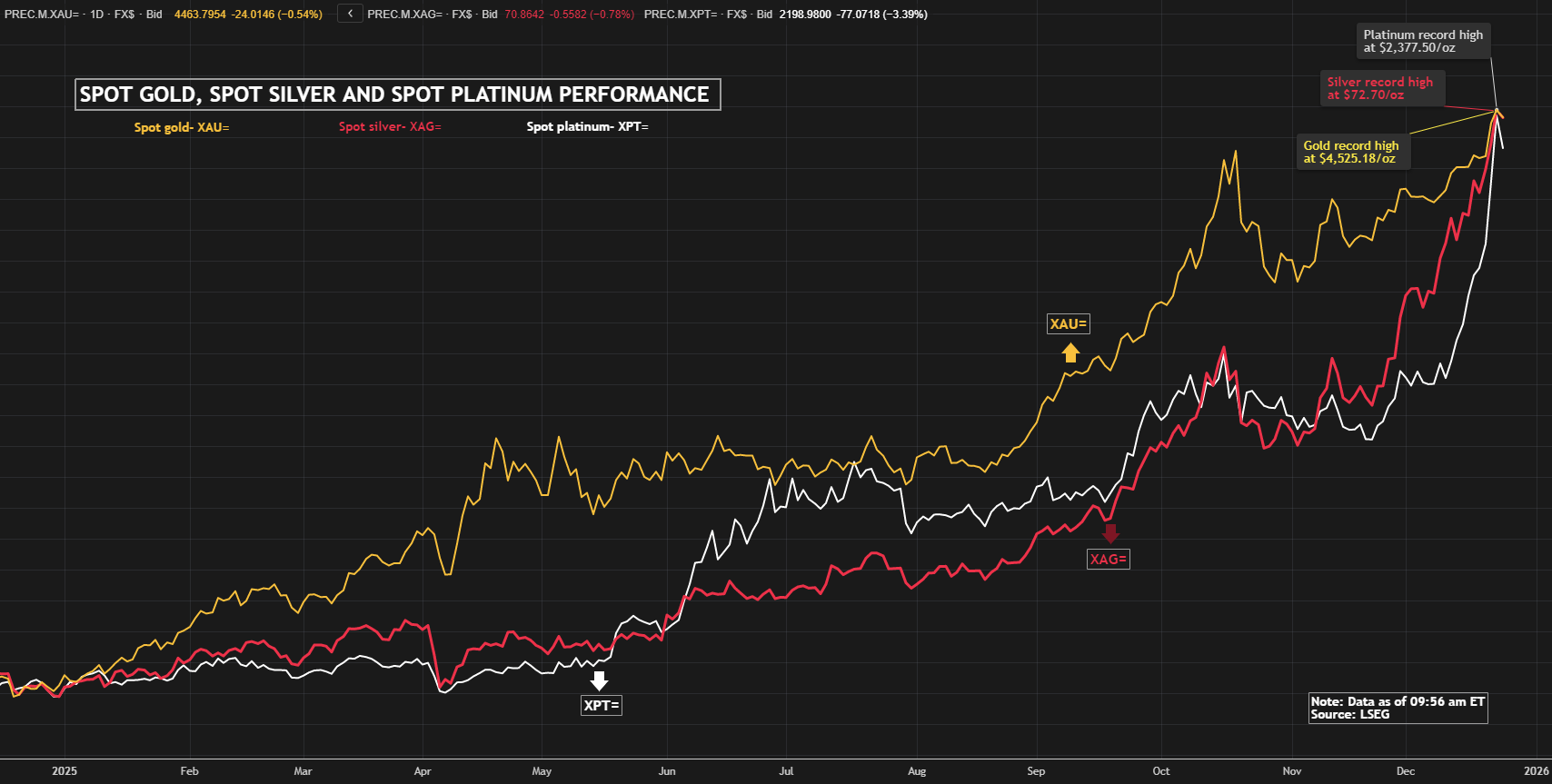 Platinum đã trải qua một năm 2025 mang tính bước ngoặt khi giá liên tục bứt phá và chính thức thiết lập mức cao nhất mọi thời đại tại 2,378 USD/ounce vào cuối tháng 12. So với đầu năm, giá platinum đã tăng hơn 160%, đánh dấu mức tăng hàng năm mạnh nhất của kim loại này trong nhiều thập kỷ.