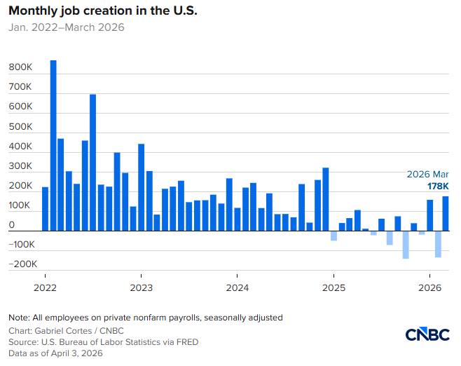 Thị trường lao động Mỹ ghi nhận nhịp phục hồi đáng chú ý trong tháng 3, với số việc làm phi nông nghiệp (nonfarm payrolls) tăng 178.000, đã điều chỉnh theo yếu tố mùa vụ — gần gấp ba lần mức dự báo đồng thuận 59.000 của Dow Jones, đồng thời đảo chiều so với mức giảm 133.000 trong tháng 2, theo số liệu từ Cục Thống kê Lao động Mỹ (BLS).