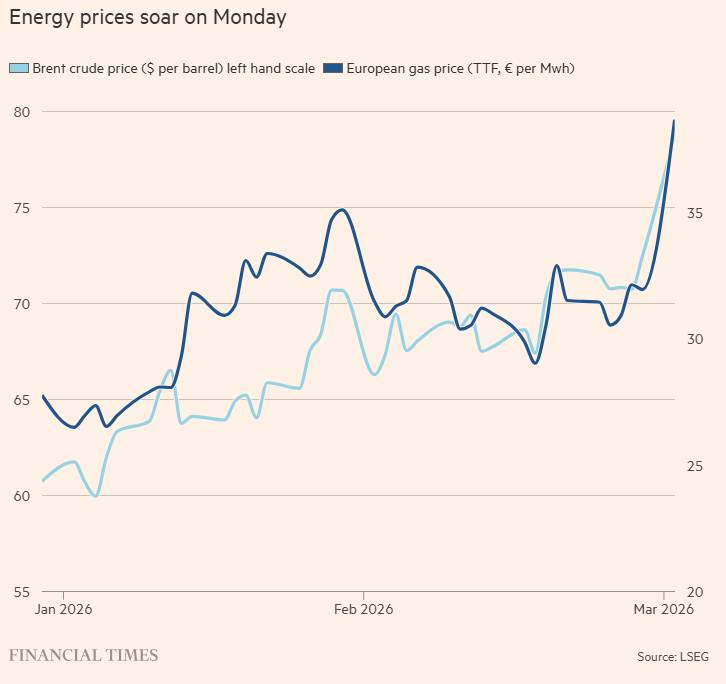Thị trường phản ứng tức thì: giá dầu Brent tăng 6% trong phiên đầu tuần lên 77 USD/thùng, trong khi giá khí đốt giao ngay tại châu Âu mở cửa cao hơn gần 20%. Tuy nhiên, hợp đồng kỳ hạn giao xa phản ánh mức độ thận trọng lớn hơn, cho thấy nhà đầu tư vẫn để ngỏ khả năng cú sốc chỉ mang tính ngắn hạn.