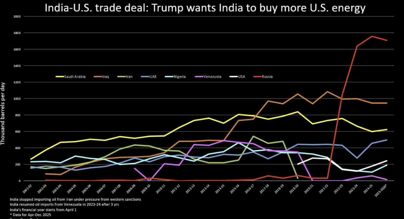 Mặc dù tuyên bố chung giữa Mỹ và Ấn Độ về khuôn khổ thương mại không đề cập đến dầu mỏ của Nga, Tổng thống Donald Trump đã bãi bỏ mức thuế 25% áp đặt lên hàng hóa Ấn Độ do mua dầu của Nga, vì ông cho rằng New Delhi đã "cam kết ngừng nhập khẩu trực tiếp hoặc gián tiếp" dầu của Nga.