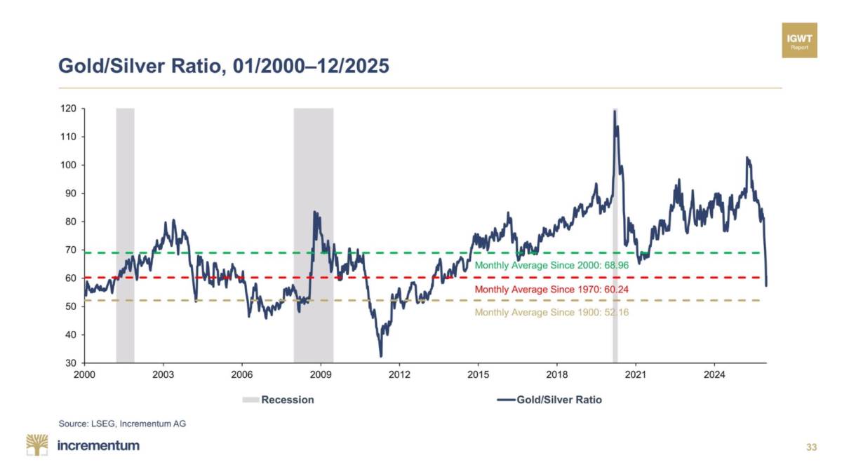 Phân tích này dựa trên giả định tỷ lệ vàng/bạc sẽ quay về các đáy lịch sử dài hạn quanh vùng 30-40, từng xuất hiện vào các chu kỳ cao điểm của bạc (1983, 1998, 2011). Nếu vàng bước vào siêu chu kỳ tăng mạnh lên 7.000-8.000 USD/oz, chỉ cần tỷ lệ vàng/bạc giảm về mức trung tính 35 thì giá bạc đã hàm ý mức tăng rất lớn, phản ánh tính đòn bẩy cao của bạc so với vàng.