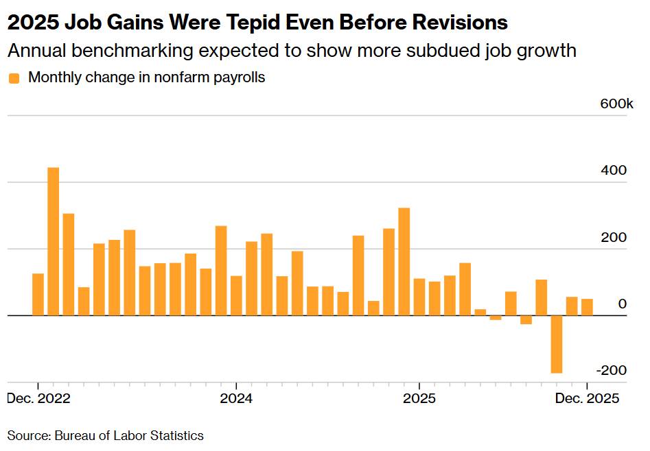 Báo cáo tháng 1 của Cục Thống kê Lao động Mỹ (BLS) – lẽ ra được công bố ngày 6/2 nhưng bị trì hoãn do đợt đóng cửa một phần của chính phủ – được dự báo sẽ ghi nhận mức điều chỉnh giảm kỷ lục 911.000 việc làm cho giai đoạn một năm tính đến tháng 3/2025. Đây là quy mô điều chỉnh đặc biệt lớn, có khả năng đảo chiều nhận định về sức khỏe kinh tế từ tăng trưởng khiêm tốn sang trạng thái tiệm cận đình trệ.