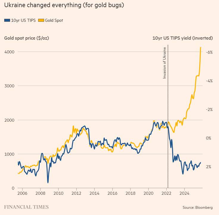 Mối tương quan truyền thống giữa lợi suất trái phiếu TIPS (chống lạm phát) của Mỹ và giá vàng – từng được xem là thước đo kỳ vọng lạm phát – nay đã sụp đổ hoàn toàn, phản ánh sự dịch chuyển cấu trúc trong hành vi nắm giữ dự trữ của ngân hàng trung ương.