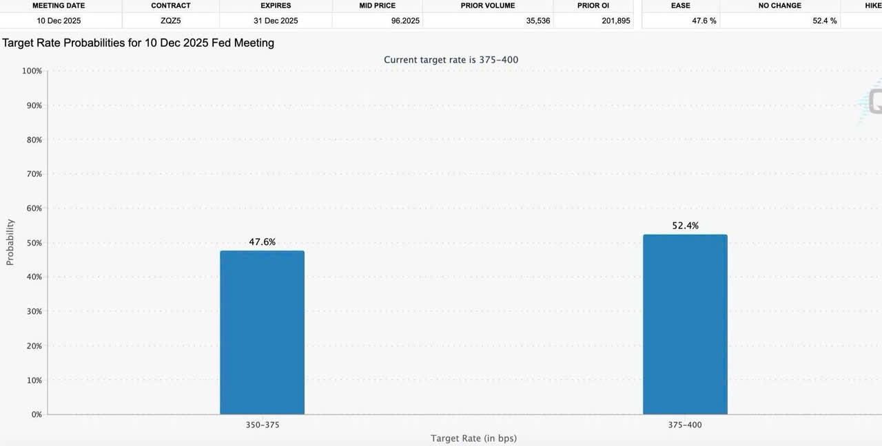 Khả năng Fed giảm lãi suất vào tháng 12 đã thu hẹp đáng kể khi các chỉ báo thị trường cho thấy mức kỳ vọng hiện chỉ còn tương đương một “ván tung đồng xu”. Trước đó, niềm tin vào việc Fed hành động ngay cuối năm từng khá mạnh khi nhà đầu tư đặt cược vào một lần giảm 0,25 điểm phần trăm. Tuy nhiên, tâm lý đó đang thay đổi nhanh chóng. Khả năng FED giảm lãi suất trong tháng 12 là 47.6%, hiện thấp hơn khả năng FED giữ nguyên lãi suất ở mức 52.4%.