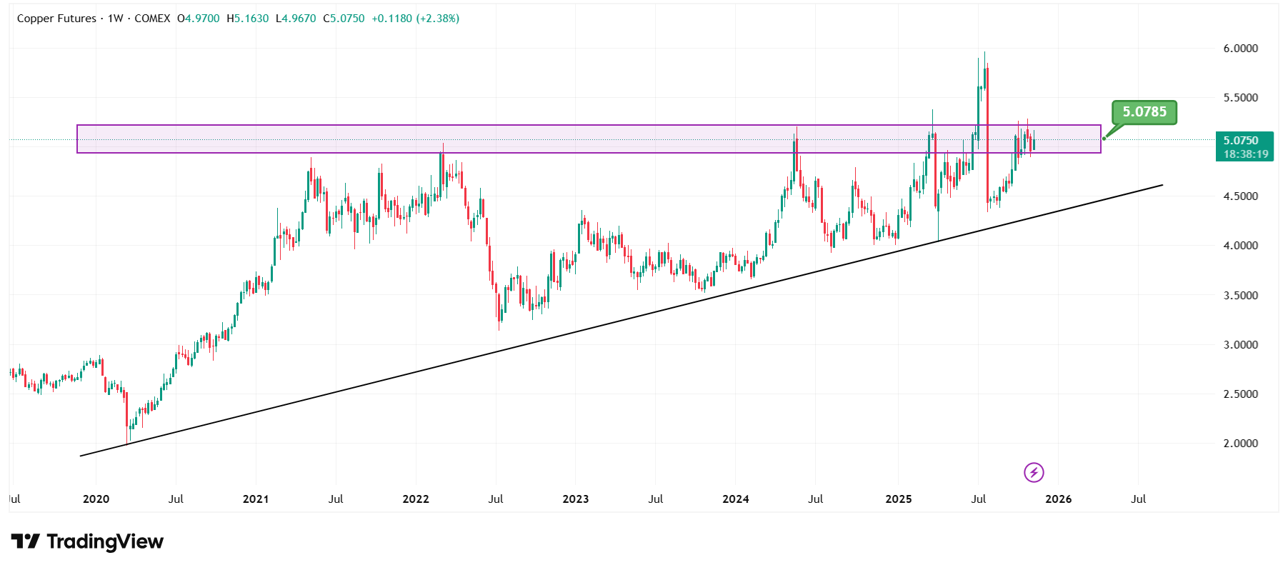 Hiện tại, giá đang ở vùng 5.07 USD/pound, đúng ngay vùng đỉnh lịch sử từng nhiều lần là kháng cự mạnh. Đây là khu vực quyết định hướng đi trung - dài hạn khi phe mua và phe bán đều tập trung lực.