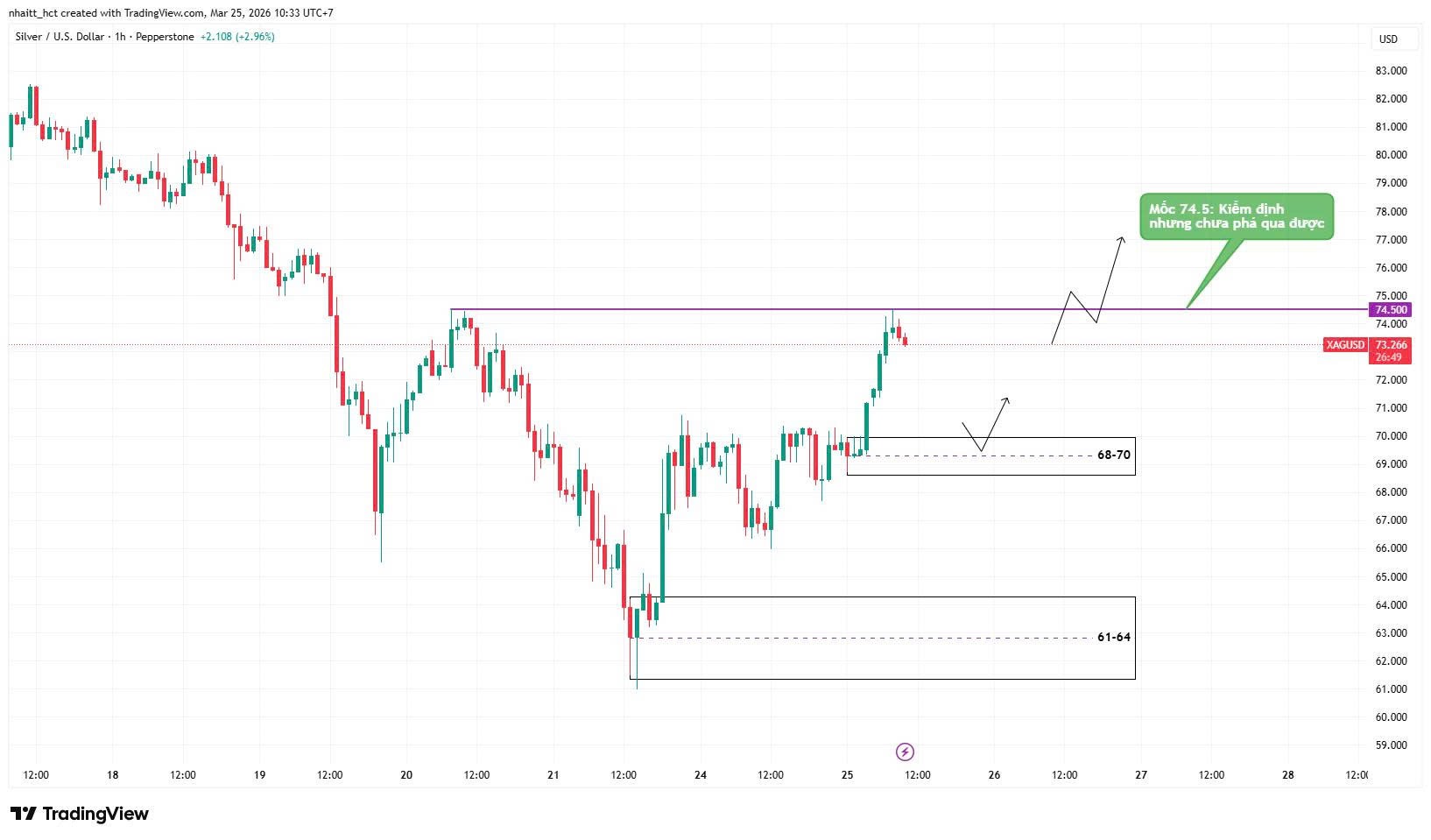 Giá Bạc hiện đang giao động quanh vùng 73.5 - 74.0, sau nhịp tăng mạnh từ khu vực 68 - 70. Động lực tăng này cho thấy lực cầu ngắn hạn đang quay trở lại rõ rệt sau giai đoạn tích lũy trước đó.