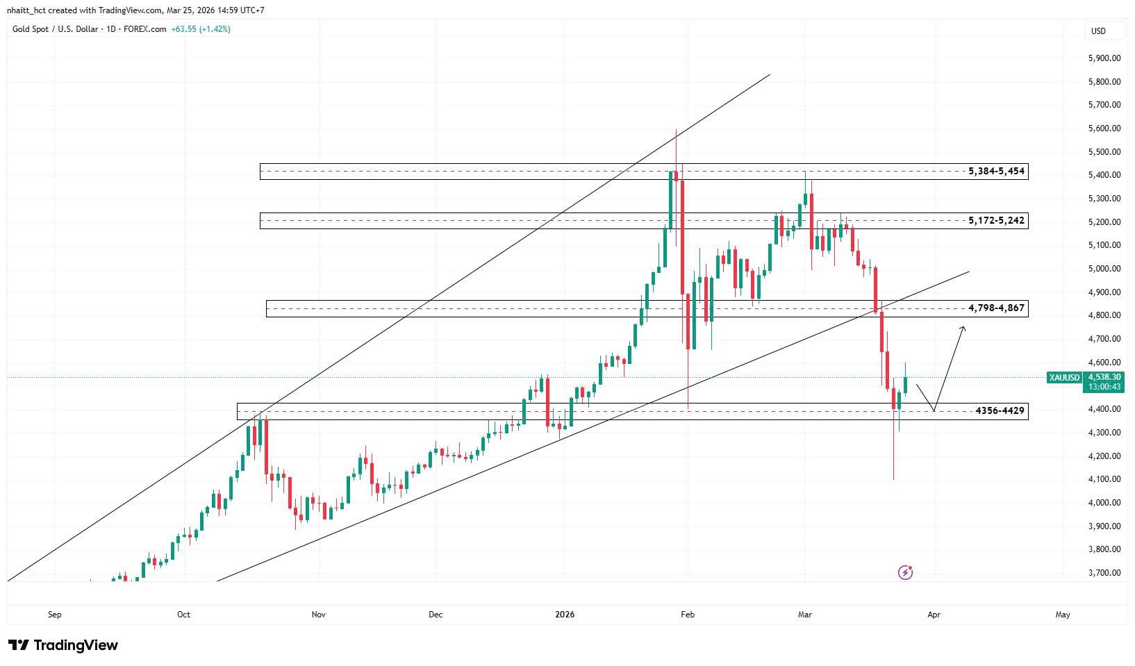 - Xu hướng ngắn hạn đã chuyển sang giảm sau khi giá phá vỡ kênh tăng và rơi mạnh từ vùng 5,400 USD xuống dưới 4,600 USD