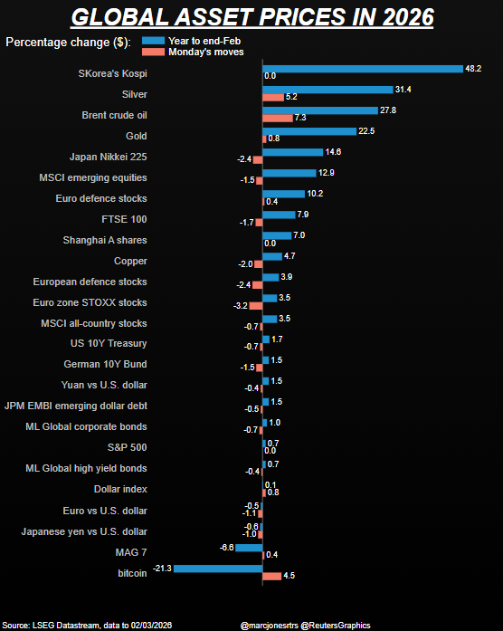 Vàng và bạc là hai thị trường chính có hiệu suất tốt thứ hai và thứ ba trong năm 2026 trước các cuộc đình công, sau chỉ số Kospi ấn tượng, trong khi chỉ số Nikkei của Nhật Bản tăng khoảng 15% trước cuối tuần – nay đã giảm hơn 4%.