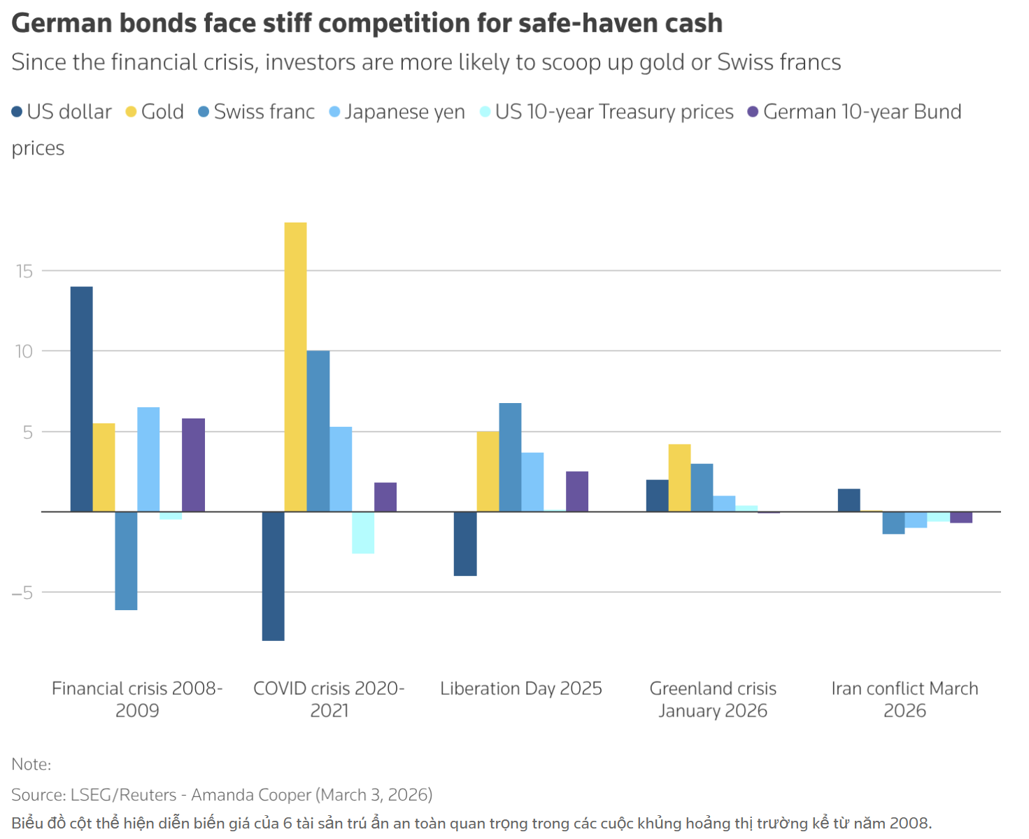 Diễn biến thị trường kỳ lạ nhất trong tuần xung đột đáng báo động ở Trung Đông là việc "nơi trú ẩn an toàn" rõ ràng nhất - vàng - lại phản ứng không như ý. Thay vì đổ xô mua vàng, các nhà đầu tư dường như lại tranh giành tiền mặt bằng đô la, bán tháo bất cứ thứ gì đã tăng giá mạnh trước các cuộc tấn công cuối tuần trước.