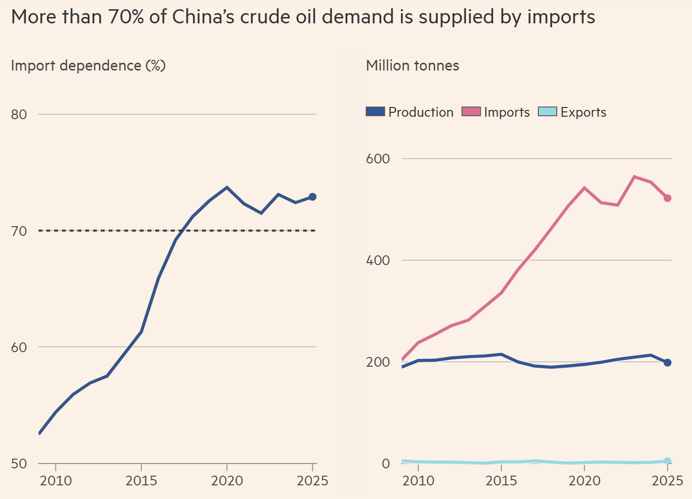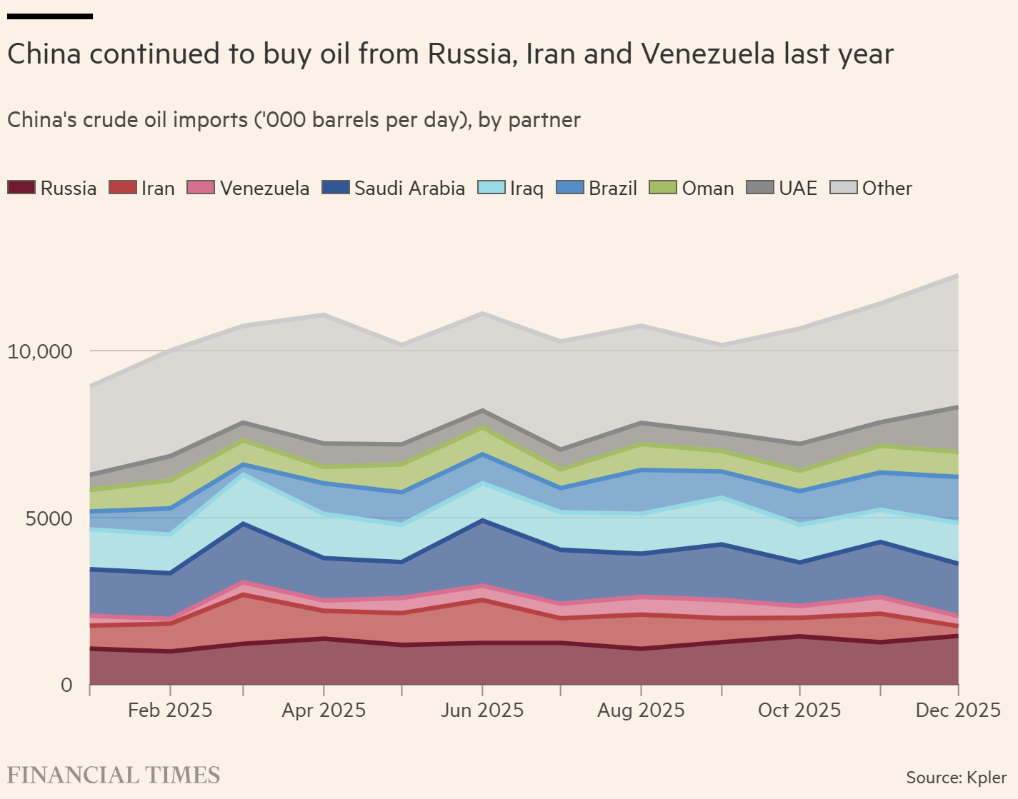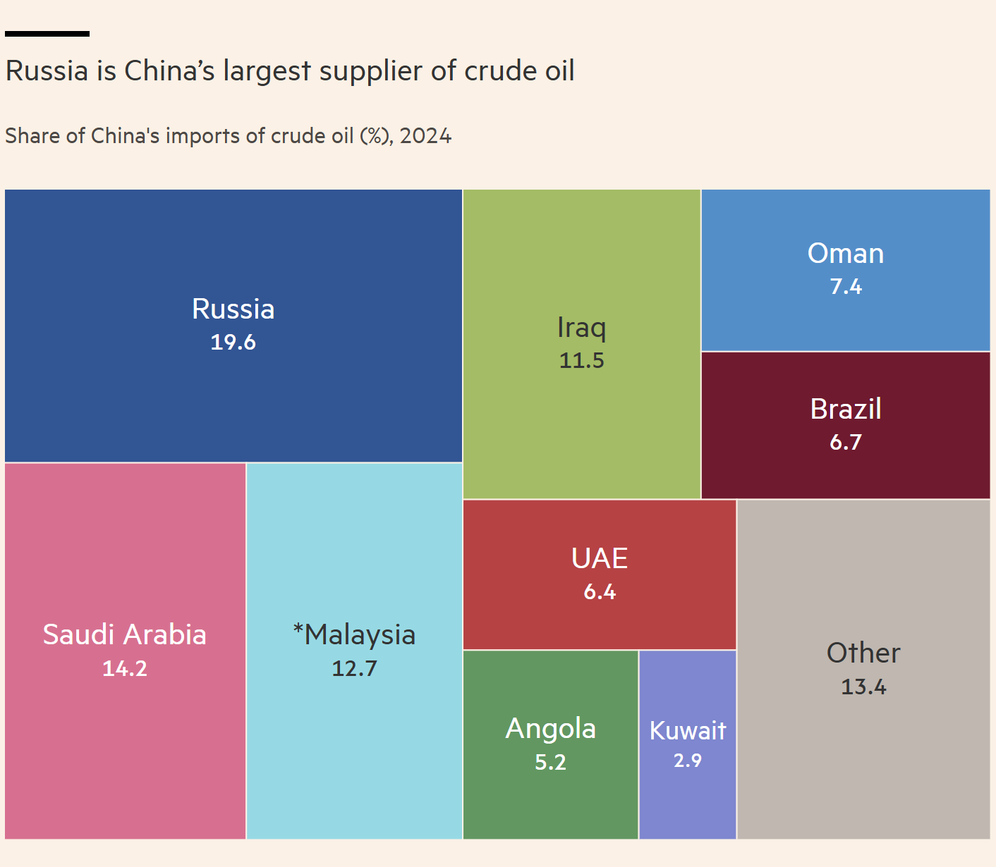 Theo số liệu hải quan Trung Quốc, Nga là nhà cung cấp dầu thô lớn nhất của Trung Quốc, chiếm 20% lượng nhập khẩu, tiếp theo là Ả Rập Xê Út với 14% và Malaysia với 13%, thông qua đó các nhà phân tích tin rằng dầu của Iran và Venezuela bị cấm vận được buôn lậu.