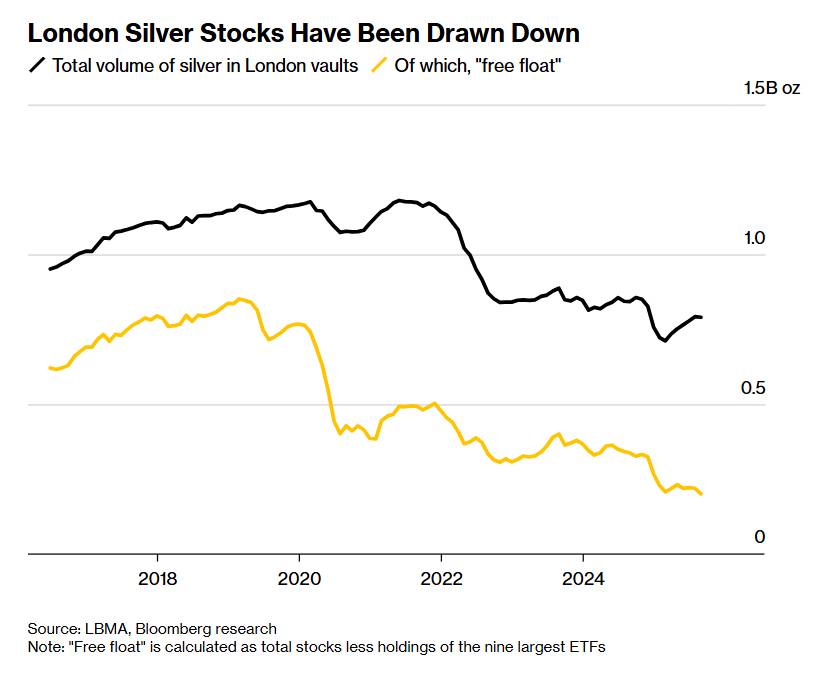 Căn nguyên của “cơn bão bạc” nằm ở sự suy giảm mạnh trong lượng dự trữ bạc sẵn có tại London. Chỉ từ giữa năm 2021 đến nay, kho bạc của London đã giảm khoảng 1/3, phản ánh cả sự mất cân đối cơ cấu dài hạn lẫn tác động từ chính sách thương mại gần đây.