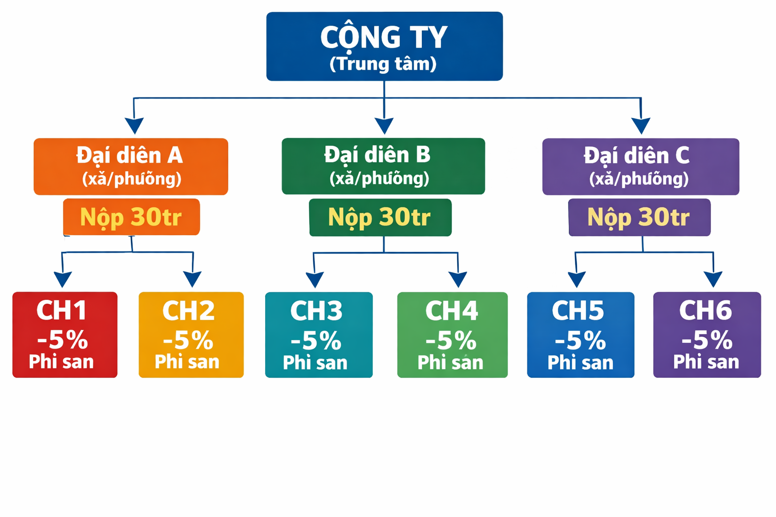 Công ty thu vào: 30 triệu × số đại diện + kiểm soát toàn bộ phí sàn 5%