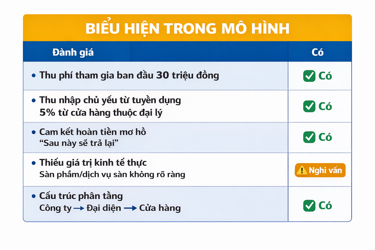 Theo Nghị định 40/2018/NĐ-CP về kinh doanh đa cấp và Luật Cạnh tranh 2018, mô hình bất hợp pháp khi có đủ các yếu tố: