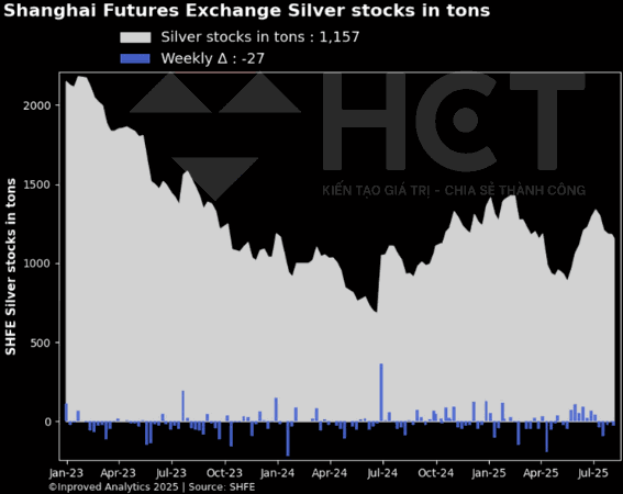 Trong bối cảnh dự trữ bạc tại Sở Giao dịch Hàng hóa Thượng Hải (SHFE) liên tục sụt giảm mạnh – đánh dấu tuần giảm thứ 4 liên tiếp với tổng lượng bạc tồn kho chỉ còn 1.157 tấn (~37,2 triệu ounce), thị trường đang gửi đi tín hiệu rõ ràng: nguồn cung bạc vật chất tại Trung Quốc đang không theo kịp nhu cầu tiêu thụ thực tế.