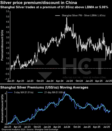 Chênh lệch giá giữa bạc tại Trung Quốc và giá bạc trên sàn LBMA hiện đã lên tới $1.85/oz (~5.1%), phản ánh áp lực cầu nội địa tăng lên nhanh chóng. Mức chênh lệch này không chỉ cho thấy nhu cầu vật chất trong nước ở mức cao, mà còn gợi ý khả năng Trung Quốc đang thực hiện chiến lược tích trữ kim loại quý trong dài hạn, giống như từng làm với các mặt hàng chiến lược khác như đồng hay đất hiếm.