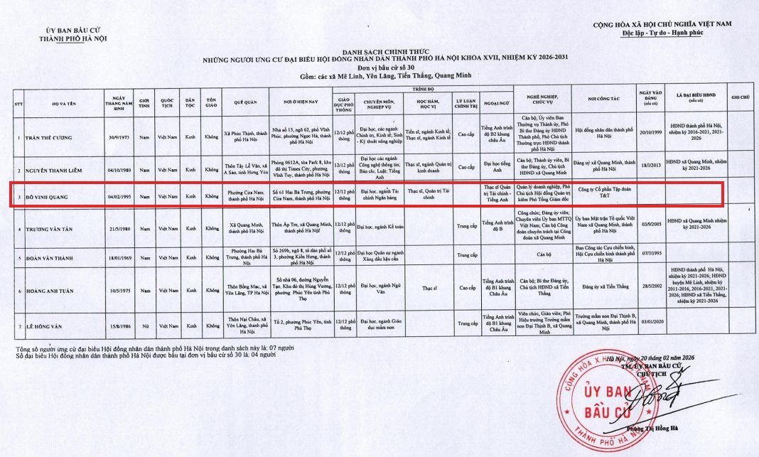 Trong số các ứng viên, ông Đỗ Vinh Quang (sinh năm 1995) ứng cử tại đơn vị bầu cử số 30, gồm các xã Mê Linh, Yên Lãng, Tiến Thắng và Quang Minh. Tại đơn vị này có 7 ứng viên, dự kiến bầu 4 đại biểu.