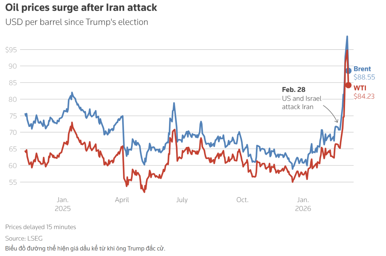 Giá dầu, vốn đã tăng vọt lên gần 120 đô la một thùng vào đầu tuần trước khi ổn định trở lại quanh mức 90 đô la, đã tăng gần 5% vào thứ Tư và tiếp tục tăng trong phiên giao dịch châu Á hôm thứ Năm giữa những lo ngại mới về sự gián đoạn nguồn cung. Các chỉ số chứng khoán chính của Phố Wall đều giảm .