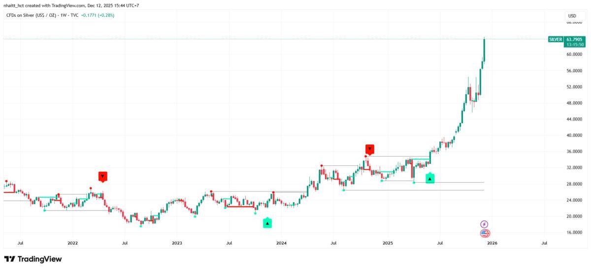 Về phân tích kỹ thuật, bạc đã xác lập xu hướng tăng dài hạn khi giá phá vỡ toàn bộ vùng tích lũy nhiều năm và bứt phá lên trên mức 60 USD/oz. Chuỗi nến tuần tăng mạnh cùng cấu trúc đáy sau cao hơn đáy trước cho thấy lực mua áp đảo, khẳng định dòng tiền lớn đang tham gia vào chu kỳ tăng mới của bạc.