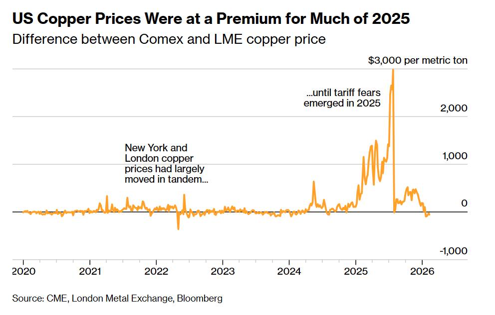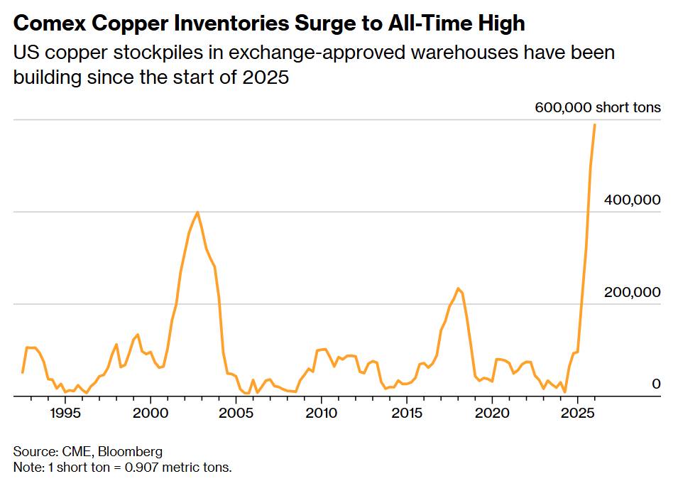 Tính đến ngày 6/2, các kho được phê duyệt cho hợp đồng tương lai đồng trên sàn CME Comex đang nắm giữ 534.405 tấn đồng – tăng gấp năm lần so với cùng kỳ năm trước và là mức cao nhất kể từ khi CME bắt đầu thống kê dữ liệu vào năm 1989. Nếu tính cả lượng tồn kho ngoài sàn, BMO Capital Markets ước tính tổng lượng đồng mà Mỹ đang “cất giữ” tiệm cận 1 triệu tấn – tương đương sản lượng cả năm của mỏ Escondida tại Chile, mỏ đồng lớn nhất thế giới.