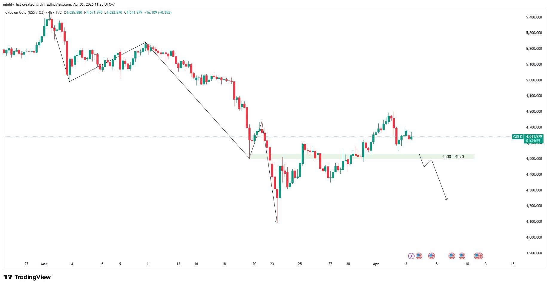 Đáng chú ý, vùng giá hiện tại quanh 4.500 - 4.600 USD đóng vai trò như một vùng hỗ trợ quan trọng, nơi thị trường hấp thụ lực bán và tái cân bằng cung cầu. Điều này phù hợp với nhận định rằng xu hướng tăng dài hạn vẫn chưa bị phá vỡ.