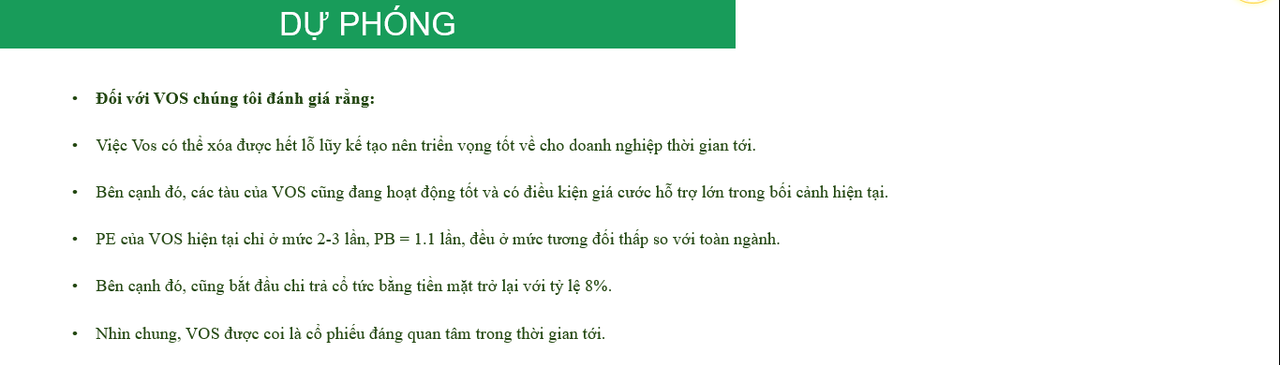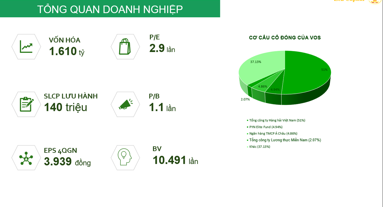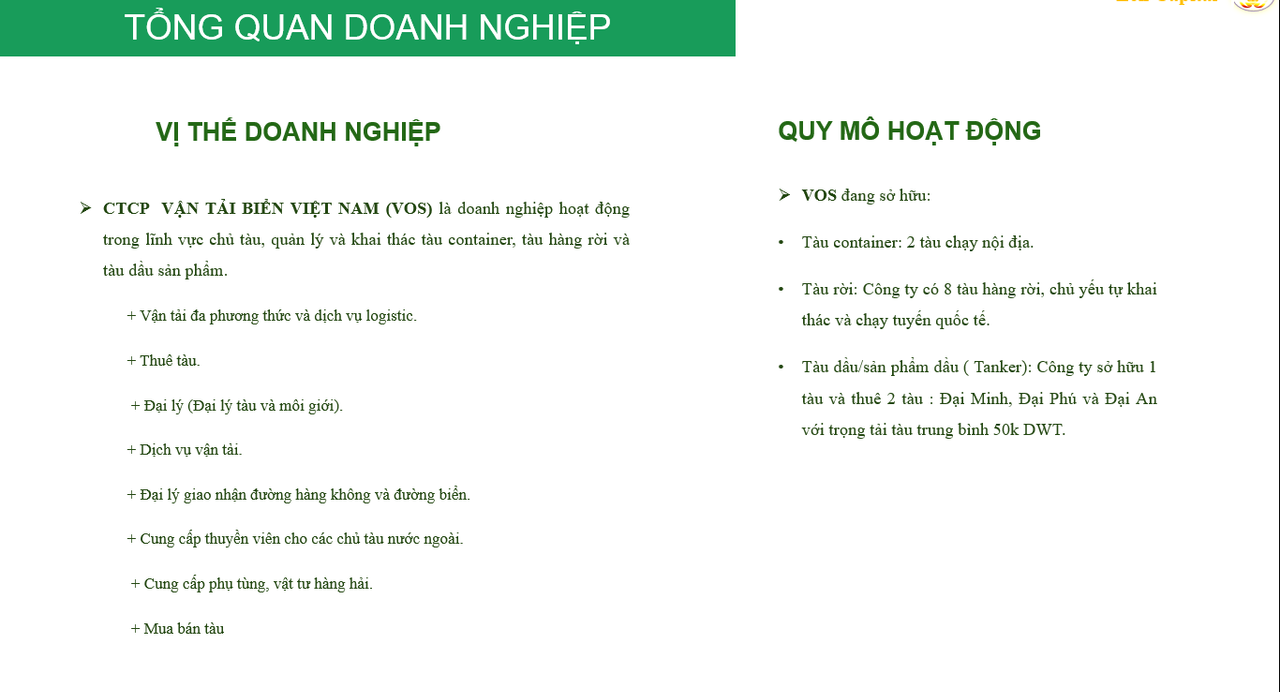 CTCP VẬN TẢI BIỂN VIỆT NAM (VOS) là doanh nghiệp hoạt động trong lĩnh vực chủ tàu, quản lý và khai thác tàu container, tàu hàng rời và tàu dầu sản phẩm.
