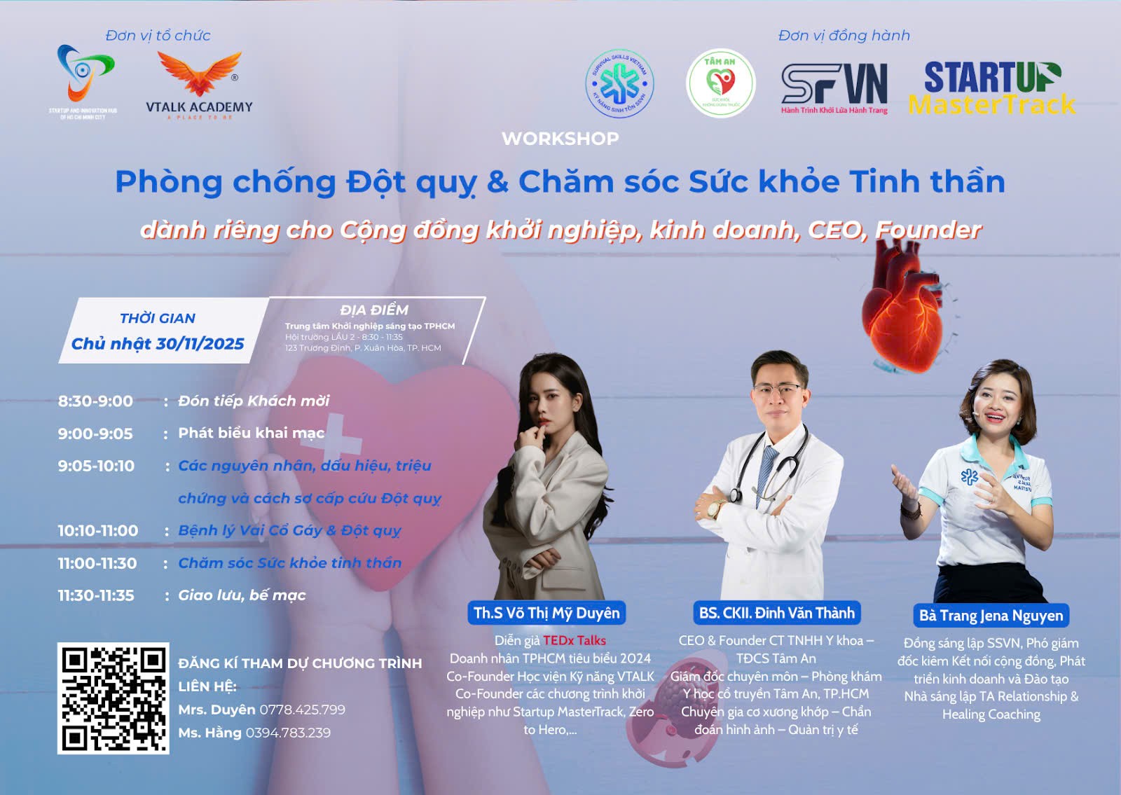 Xuất phát từ nỗi trăn trở đó, Workshop “Phòng chống đột quỵ & Chăm sóc sức khỏe tinh thần (dành riêng cho cộng đồng khởi nghiệp, kinh doanh, CEO, Founder)” hoàn toàn miễn phí được xây dựng với mong muốn giúp cộng đồng doanh nhân, CEO, Founder và đội ngũ khởi nghiệp nhận diện sớm các nguy cơ, hiểu rõ mối liên hệ giữa bệnh lý và lối sống, đồng thời học cách duy trì sự cân bằng trong hành trình phát triển doanh nghiệp. Chương trình đặc biệt này được tổ chức bởi Học viện Kỹ năng VTALK phối hợp với Trung tâm Khởi nghiệp Sáng tạo TP.HCM (SIHUB), với các đơn vị đồng hành Doanh nghiệp Kỹ năng Sinh tồn Việt Nam (SSVN), Công ty TNHH Y Khoa - TĐCS Tâm An và các đơn vị khác.