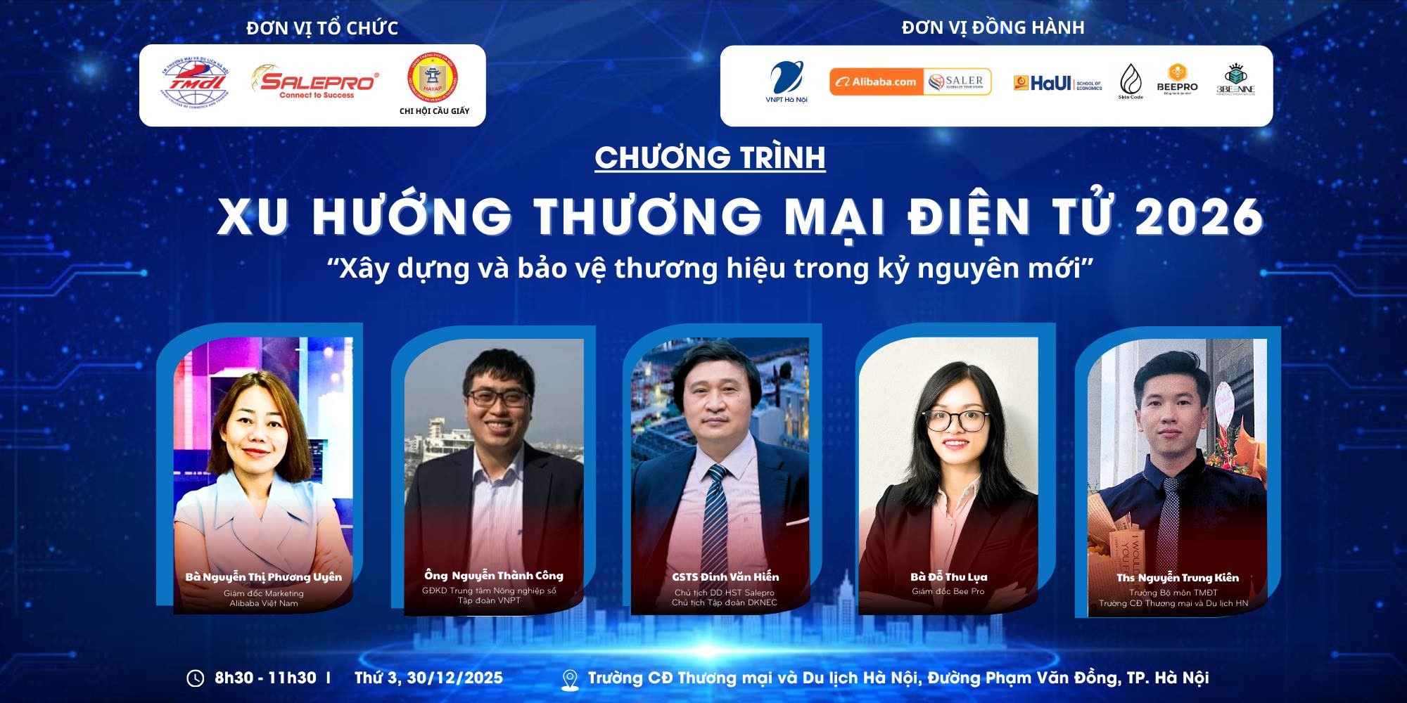 Hội thảo diễn ra từ 8h30 đến 11h30, ngày 30/12/2025, tại Trường Cao đẳng Thương mại & Du lịch Hà Nội (đường Phạm Văn Đồng, Hà Nội). Do số lượng vé mời có hạn, Ban tổ chức khuyến nghị các doanh nghiệp và cá nhân quan tâm đăng ký sớm để chủ động tham dự, góp phần nắm bắt xu hướng và dẫn đầu cuộc chơi thương mại điện tử trong giai đoạn tới.