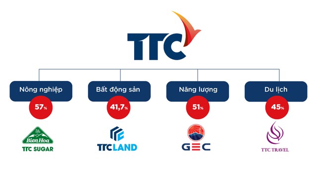 - Cụ thể, TTC Group sở hữu một số công ty mía đường lớn như Thành Thành Công Tây Ninh (tên cũ là Bourbon Tây Ninh), đường Ninh Hòa, Thương mại Thành Thành Công (kinh doanh đường) và 11% vốn tại CTCP Địa ốc Sài Gòn Thương Tín - Sacomreal (sau này đổi tên là TTC Land).