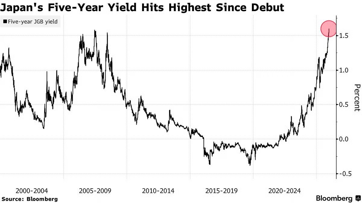 Lợi suất trái phiếu chính phủ Nhật Bản kỳ hạn 5 năm đã tăng mạnh và đạt 1.62%, đánh dấu mức cao nhất kể từ khi loại trái phiếu này ra mắt vào năm 2000. Diễn biến này phản ánh sự thay đổi rõ rệt trong kỳ vọng của thị trường đối với chính sách tiền tệ và tài khóa của Nhật Bản sau nhiều năm duy trì môi trường lãi suất cực thấp.